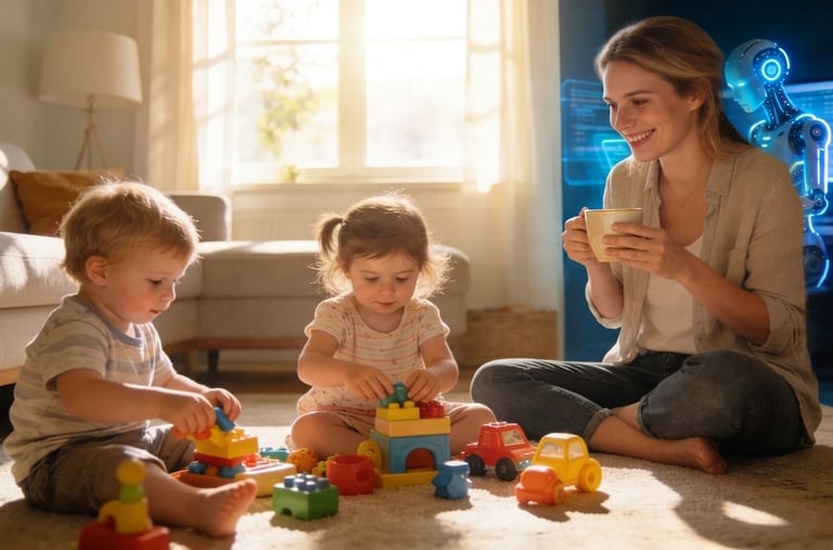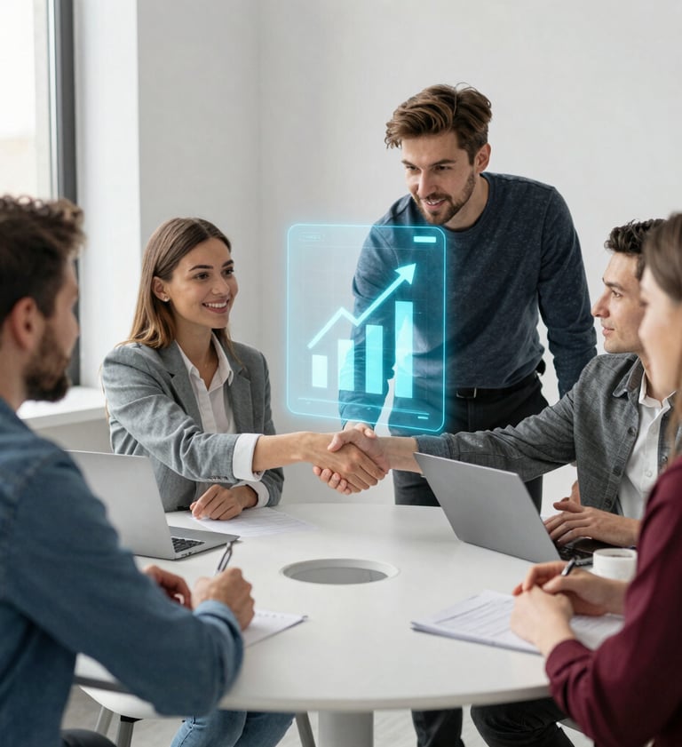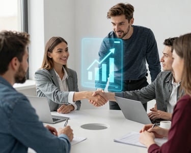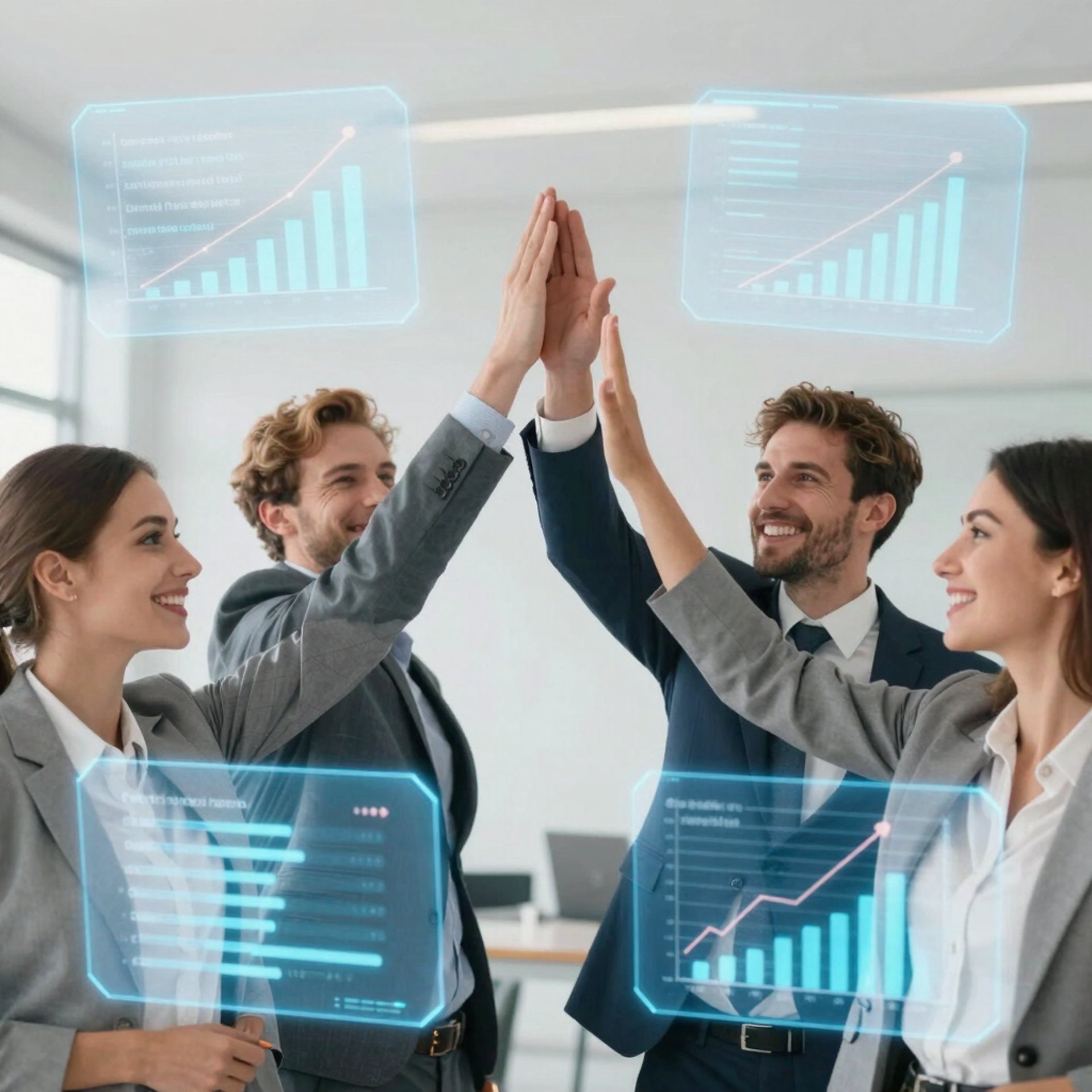 A group of professionals from different industries collaborating around a holographic AI interface in a sleek, tech-inspired room.